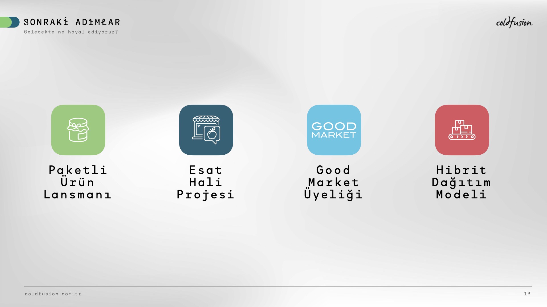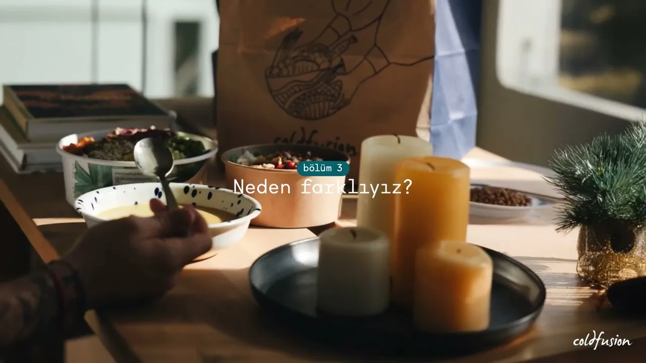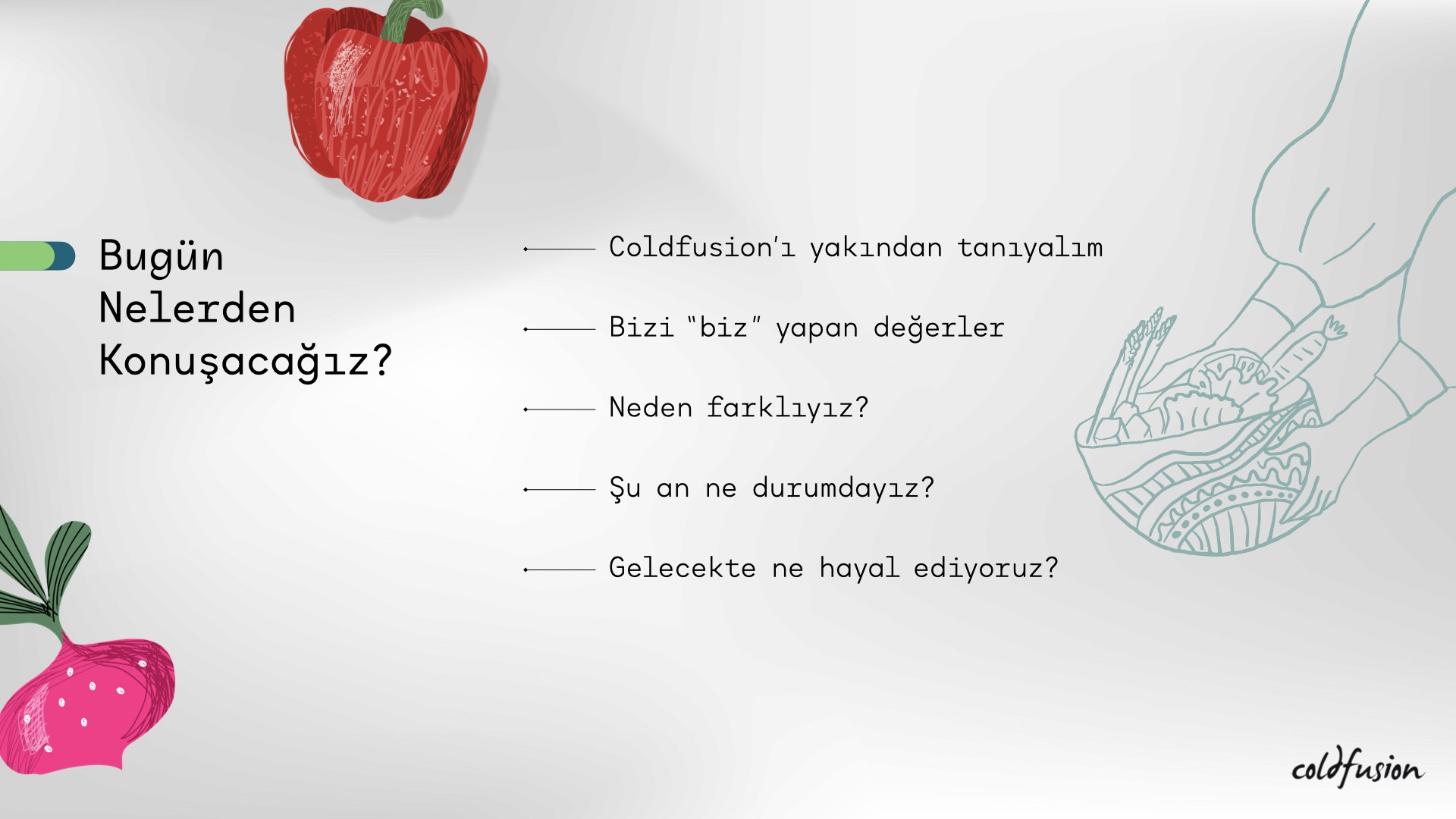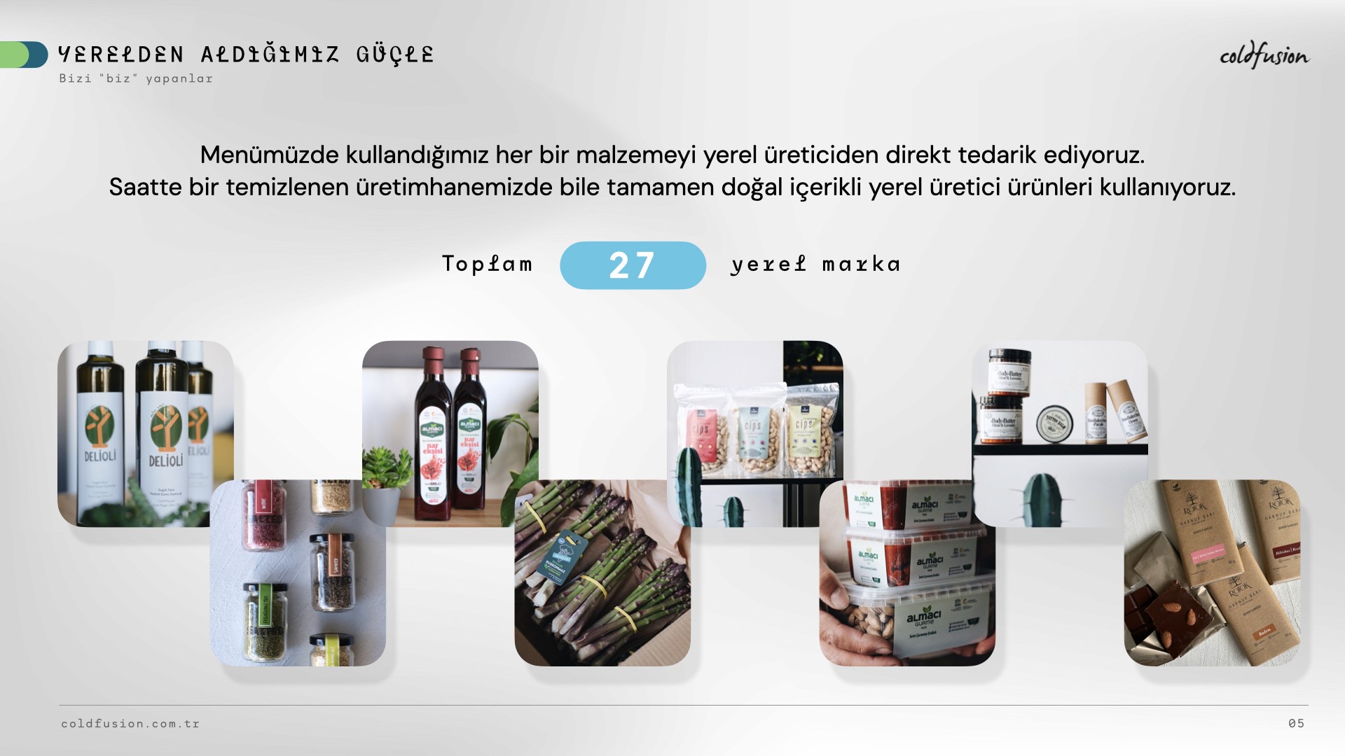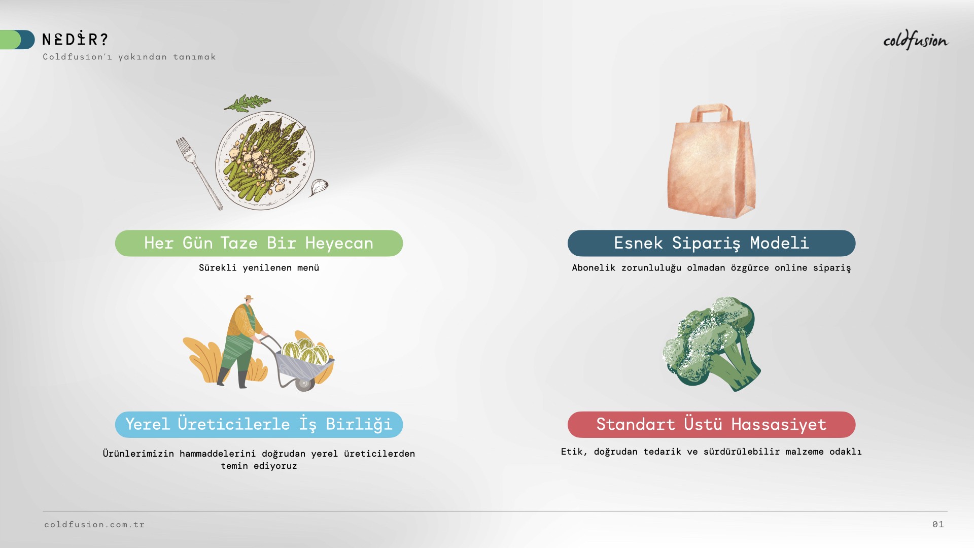 Brand and investor presentation for Coldfusion, a plant-based food startup focused on sustainability, transparency, and local partnerships.